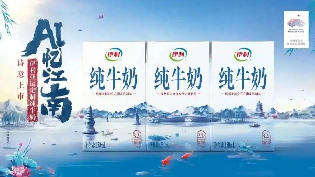 6月13日,在“杭州亞運會倒計時100天”之際,伊利推出「亞運定制純牛奶」AI憶江南限定系列包裝。產品以AIGC技術輔助包裝設計,通過“科技感、自然生機、東方美學、未來感、極簡和童真”6個關鍵詞,讓傳統(tǒng)古典美與前沿科技充分碰撞,給消費者帶來全新視覺體驗。