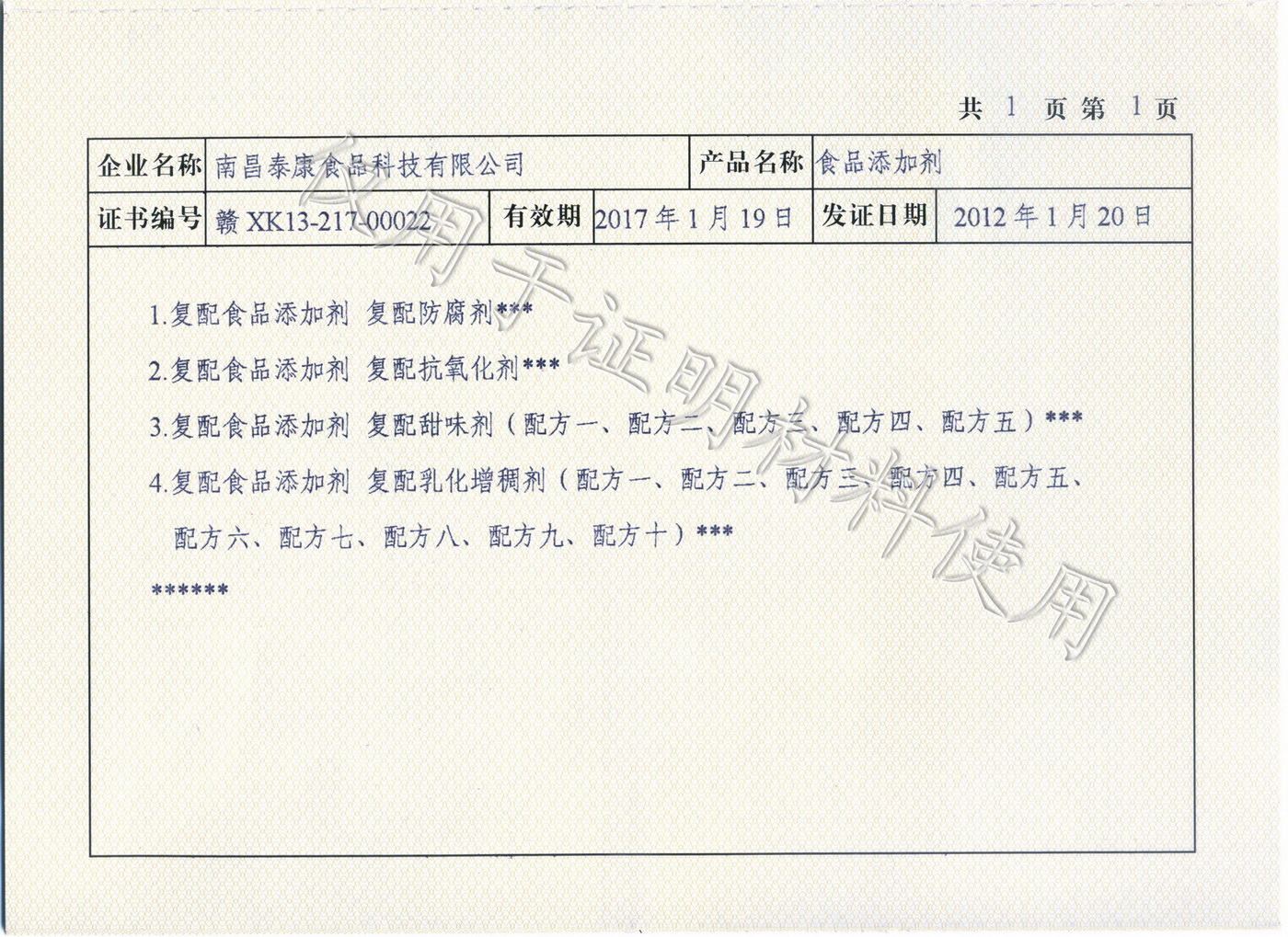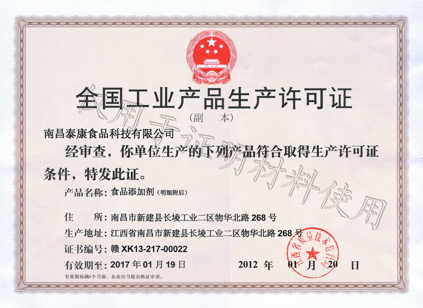 2012年1月20日,我公司順利獲得了由省質(zhì)監(jiān)局頒發(fā)的食品添加劑生產(chǎn)許可證書。