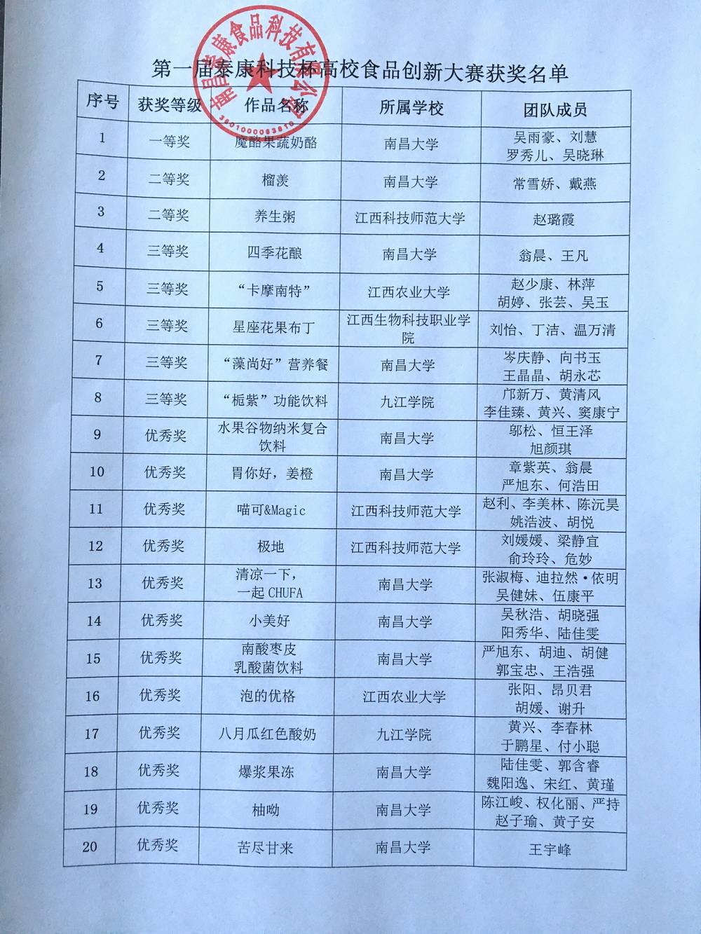 第一屆“泰康科技杯”高校食品創(chuàng)新大賽自2017年11月起在南昌大學(xué),江西農(nóng)業(yè)大學(xué)等多所高校學(xué)子的熱情參與下,經(jīng)過近三個月的時間,終于落下帷幕,現(xiàn)將大賽獲獎名單公布: